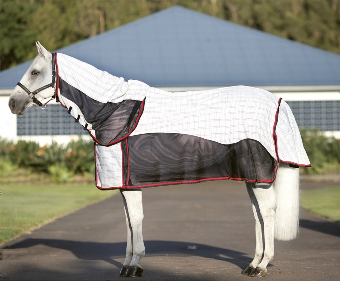 Its unique hybrid design fuses the cooling benefits of mesh alongside special ripstop material which is tactically woven to outlast daily wear and tear. Proven to be a great, sturdy solution for the active horse who requires airflow and protection from the sun and insects.