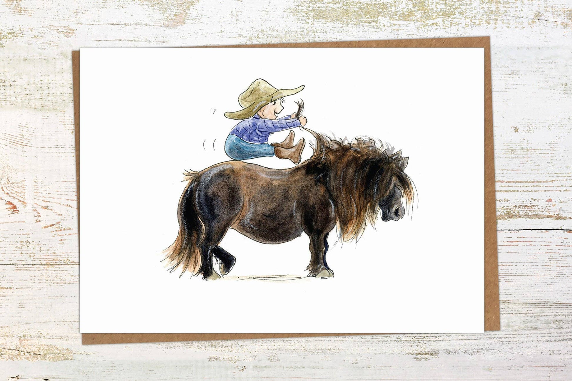 This funny pony greetings card features a gorgeous little Shetland pony with tousled locks and short legs with an enthusiastic child on board. This wonderful piece of artwork makes a perfect birthday or greetings card for both adult and child pony enthusiasts.